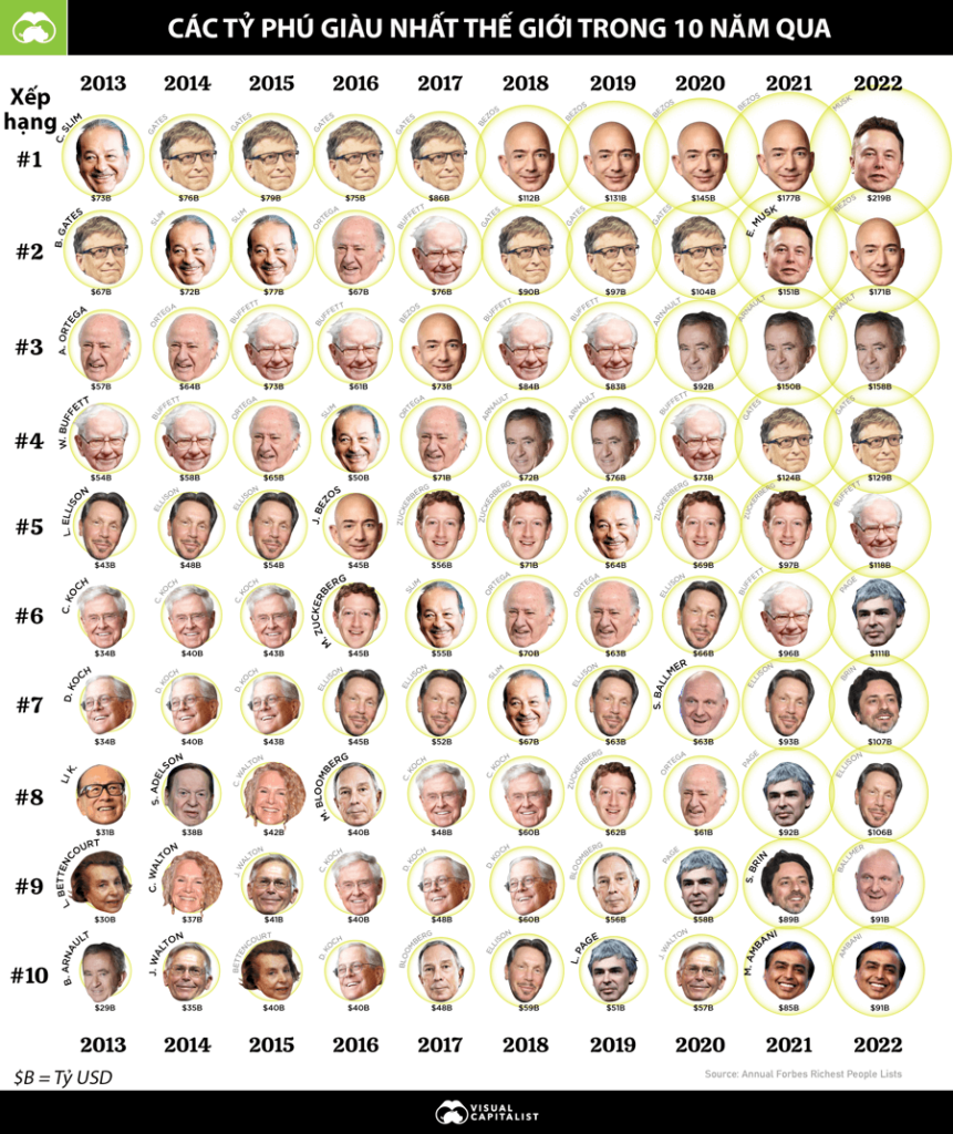 Sử dụng dữ liệu hàng năm từ Forbes, biểu đồ dưới đây thể hiện tài sản và xếp hạng của 10 tỷ phú giàu nhất thế giới trong thập kỷ qua.